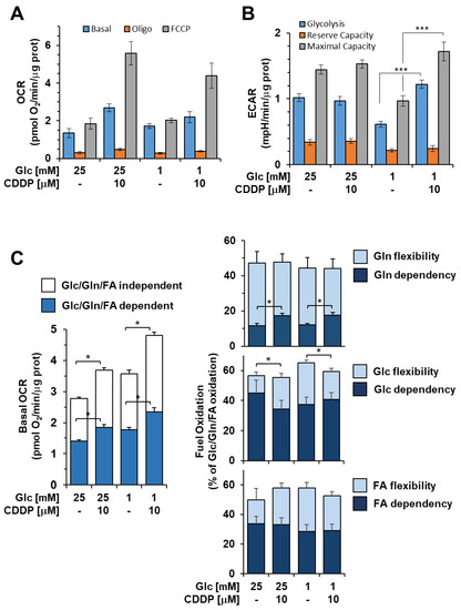 Cisplatin (CDDP) effects on metabolic fluxes and mitochondrial respiratory activities 3AB-OS CSCs. Cells were incubated 48 h with 10 μM CDDP under high and low glucose growth conditions as indicated and subjected to Seahorse analysis for OCR (A) and ECAR (B) as detailed in Figure 1A,B. Bar values are means ± SEM of three independent biological replicates each carried out in triplicate; ***, p < 0.001. (C) Mitochondrial dependency on and flexibility for oxidation of glucose (Glc), glutamine (Gln), and long chain fatty acids (FA) in presence or absence of CDDP, in high and low glucose nutrient media. The bar histogram on the left shows the combined contribution of glucose (Glc), glutamine (Gln) and long chain fatty acids (FA) to the basal OCR; the residual activity is defined as Glc/Gln/FA-independent OCR. The tripartite bar histograms on the right show the dependency and flexibility of the 3AB-OS OCR relatively to one or the other of Glc, Gln and FA as respiratory substrates. Bar values are means ± SEM of three independent biological replicates each carried out in triplicate; *, p < 0.005. See Materials and Methods for further details. Abbreviations: oligo, oligomycin; FCCP, carbonyl cyanide 4-(trifluoromethoxy)phenylhydrazone; OCR, oxygen consumption rate; ECAR, extracellular acidification rate.