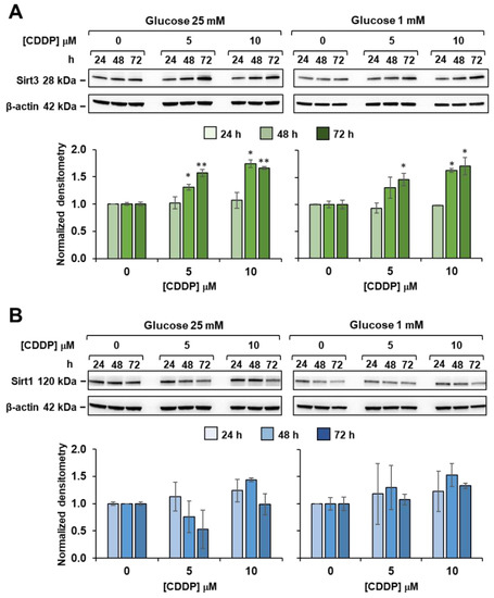Western blot analyses (Figure 9A) showed that 5 and 10 µM cisplatin treatments elicited Sirt3 upregulation at 48 and 72 h, in both high and low glucose media. On the other hand, no significant differences were detected in the amounts of Sirt1 from cisplatin-treated 3AB-OS (Figure 9B). A significant increase in Sirt1 expression could be noticed only after 48 h exposure to 10 µM cisplatin in high glucose. However, as mitochondrial OCR remained unchanged after exposure to cisplatin, in the presence or absence of the Sirt1 inhibitor EX-527 (data not shown), it could be argued that the observed metabolic reprogramming was a Sirt1-independent process.