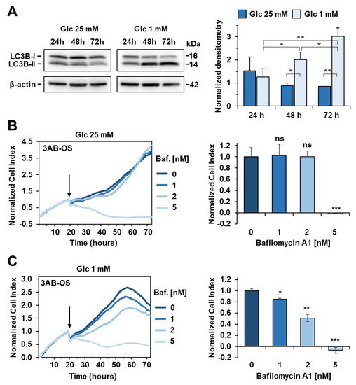 Activation of autophagy flux during glucose (Glc) starvation in 3AB-OS CSCs. (A) Left panel: representative immunoblotting for protein expression levels of LC3B in high and low glucose, after incubation at 24 h, 48 h and 72 h; β-actin was used as loading control. Right panel: densitometric analysis displaying LC3B-II/LC3B-I ratio (normalized to β-actin), expressed as mean ± SD of three independent experiments (* p < 0.05, ** p < 0.01). (B) Left panel: representative NCI traces of 3AB-OS CSCs after exposure to 1, 2, 5 nM bafilomycin A1 (Baf) and vehicle (control). CSCs were cultured for approximately 24 h in 25 mM Glc DMEM medium, and then treated with the indicated concentrations of Baf in high glucose for 48 h. Right panel: the bar histogram shows NCI variations after 24 h exposure to Baf or vehicle. Data are expressed as mean ± SD of three independent experiments. Statistical significances are referred to control; *** p < 0.0001. (C) Left panel: representative NCI traces of 3AB-OS CSCs after exposure to 1, 2, 5 nM bafilomycin A1 (Baf) and vehicle (control). CSCs were cultured for approximately 24 h in 1 mM Glc DMEM medium, and then treated with the indicated concentrations of Baf in low glucose for 48 h. Right panel: the bar histogram shows NCI variations after 24 h exposure to Baf or vehicle. Data are expressed as mean ± SD of three independent experiments. Statistical significances are referred to control; * p < 0.05, ** p < 0.01, *** p < 0.0001.
