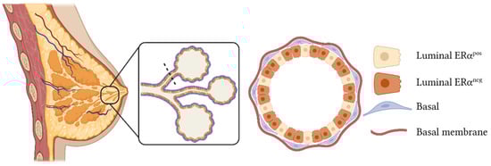Breast cancer is the most common cancer in women worldwide and is the second leading cause of cancer death in women, exceeded only by lung cancer (based on data from the World Health Organization, 2021). This type of cancer originates in the mammary gland, which is a ductal tree composed of two epithelial compartments: cells facing the ductal lumen called luminal cells (LCs), and basal cells (BCs) found in the outer layer with a capacity to contract, which includes basal progenitor cells and terminal differentiated myoepithelial cells. Luminal cells can be further subdivided into two independent subpopulations based on the expression of the hormone receptor, estrogen receptor alpha (ERα) [1] (Figure 1).