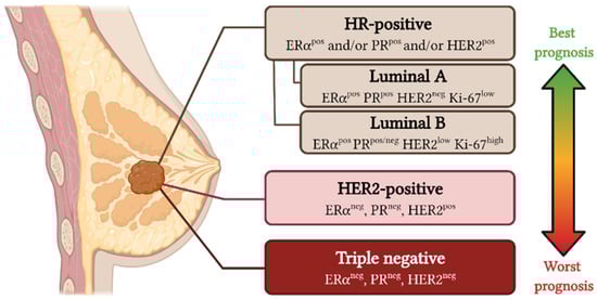 Molecular classification of breast cancer subtypes. Breast cancer can be divided into three main subtypes depending on the histological expression of four markers (ERα, PR, HER2, and Ki-67): hormone receptor (HR)-positive, HER2-positive, and triple-negative. This figure was created with Biorender.com (accessed on 12 December 2021).