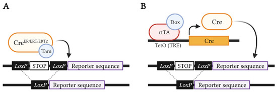 Inducible Cre/Lox systems. (A) Tamoxifen-inducible Cre/Lox model, where, upon tamoxifen (Tam) administration, the cells expressing CreER, CreERT, or CreERT2 (determined by a specific promoter) will be labeled with β-galactosidase, fluorescent protein(s), or barcode sequence(s) due to the Cre-mediated recombination of the loxP sites, excising the STOP codon in the reporter transgene. (B) Tetracycline-inducible Tet/Lox system, where, upon doxycycline (Dox) administration, the cells expressing rtTA will be labeled by the chosen reporter due to the binding of the rtTA transactivator to TRE sequences (such as transcriptional activation elements (TetO)), resulting in Cre expression and consequent excision of the loxP-flanked STOP codon upstream to the reporter transgene. This figure was created with Biorender.com (accessed on 12 December 2021).