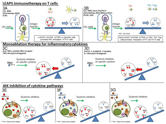 Comparison of cytokine-targeting therapies to treat autoimmune conditions. LEAPS immunomodulating therapy: (3A) CEL-2000 J-LEAPS vaccine: Immunization of diseased animals activates dendritic cells to promote antigen-specific Th1 responses and IL-10 to modulate the disease driving Th17 and inflammatory cytokine responses and provide therapy. (3B) CEL-4000 and related DerG-LEAPS vaccines: CEL-4000 vaccination of diseased animals activates antigen-specific CD4 Th2 and Treg cells to modulate the disease driving Th1, Th17 and inflammatory cytokine responses. Treatment favors a ratio of increased anti-(IL-4, IL-10) vs. pro-(IFN-γ or IL-17) for cytokine secreting CD4 spleen T cells. Monoablation therapy for inflammatory cytokines (DMARDS): (3C) Neutralizing antibody to IL-1, TNFα, or IL-6 (not shown); (3D) Receptor antagonist inhibition of cytokine action: Neutralization or blocking of cytokine receptor by antibody can prevent systemic action of a specific inflammatory cytokine but also affects antimicrobial and other immune responses. Treatment has no effect on anti-inflammatory cytokines. Inhibition of JAK-tyrosine kinase cascade: (3E–3G) Inhibitors of of different JAKs: Small molecular inhibitors of JAK1, JAK2, JAK3 or tyrosine kinase 2 (TYK2) block the signal transmission from associated cytokine receptors to block inflammatory and regulatory responses, depending upon the JAK(s) that are inhibited. These inhibitors downregulate transcription of one or more cytokine gene, as listed in Table 1.