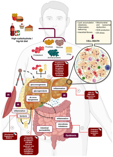 Molecular mechanisms and therapeutic targets involved in NAFLD. High-carbohydrate and/or high-fat diet leads to multisystem dysregulation that exacerbates the gluconeogenesis, glycogenolysis, and de novo lipogenesis pathways in the liver, contributing to liver fat accumulation and inflammation. Moreover, dysregulation of the gut-liver-axis emerges as another pathological mechanism in NAFLD. Numerous pharmacological treatments have been developed to act on different processes involved in the onset and progression of the disease. Abbreviations: ER stress, endoplasmic reticulum stress; FFAs, free fatty acids; IR, insulin resistance; ROS, reactive oxygen species. Created with BioRender.com (last access: 22 November 2021).