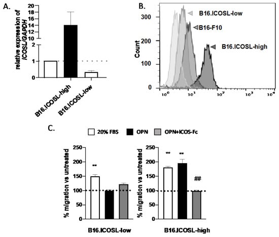 Engineering of B16-F10 melanoma cell lines expressing stable levels of ICOSL. (A) Relative quantification of ICOSL RNA in B16-ICOSL-high and B16-ICOSL-low cells; the dotted line shows B16-F10 parental cells. Data are shown as means ± SEM gene expression relative to expression of the endogenous control GAPDH (2−ΔCt method). One representative experiment is shown (n = 3 biological replicates); (B) representative histogram showing surface expression of ICOSL in B16-ICOSL-high (dark gray), B16-ICOSL-low (gray), and parental B16-F10 cells (light gray); (C) migration of B16-ICOSL-high and B16-ICOSL-low cells in response to 10 μg/mL of rhOPN or 20% FBS as chemotactic stimulus. The gray column shows inhibition of OPN-induced migration by ICOS-Fc. The dotted line shows the migration of control cells, set at 100% in the absence of chemotactic stimuli. Data are expressed as means ± SEM (n = 5) of the number of migrated cells per high-power field, ** p < 0.01 refers to baseline, ## p < 0.01 refers to OPN-induced migration, one-way ANOVA test was used.