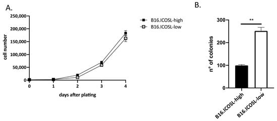 ICOSL expression inhibits anchorage-independent tumor cell growth. (A) Kinetic growth assay of B16-ICOSL-low and B16-ICOSL-high cells in the presence of 10% FBS (n = 2). Cells were counted following trypan blue staining; (B) the soft agar colony formation assay was run to estimate anchorage-independent growth of B16-ICOSL-low and B16-ICOSL-high cells. Colonies were counted digitally using ImageJ software. Data are expressed as means ± SEM. The Mann–Whitney statistical test was used, ** p < 0.01.