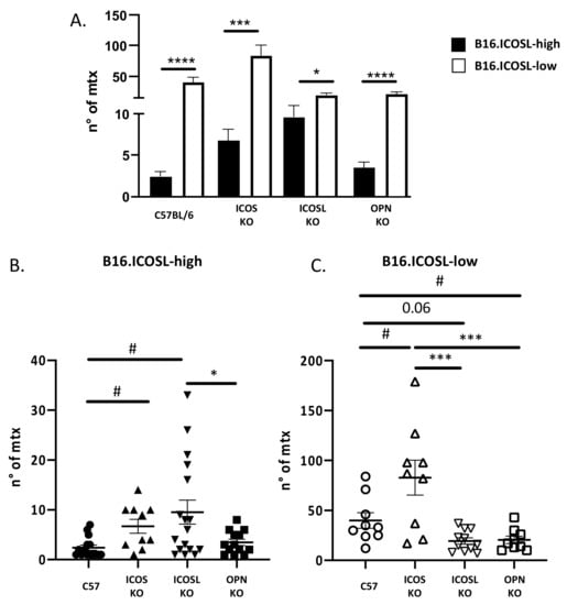 The first comparison between B16-ICOSL-low and B16-ICOSL-high cells showed that the former produced more metastases than did the latter, in OPN-KO, ICOS-KO, and ICOSL-KO strains, and in wild-type mice (Figure 5A).