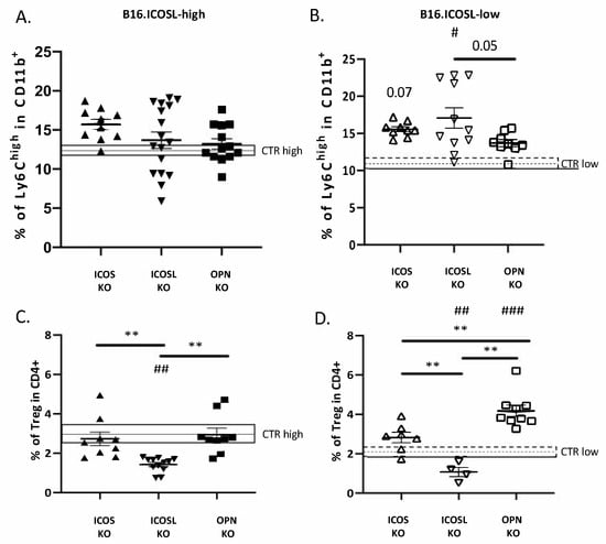 As in wild-type C57BL/6 mice also in ICOS-KO, OPN-KO and ICOSL-KO mice, m-MDSC and Treg were not significantly different in lungs metastasized by B16-ICOSL-high versus B16-ICOSL-low cells (Figure 6). On the contrary, comparison of wild-type mice with each KO strain showed that: (1) M-MDSC were significantly increased in ICOS-KO and a trend (p = 0.07) was found in ICOSL-KO mice when injected with B16-ICOSL-low, but not with B16-ICOSL-high cells (Figure 6A,B); (2) Tregs were decreased in ICOSL-KO mice injected with both B16-ICOSL-high -low cells, and increased in OPN-KO mice with B16-ICOSL-low cells, but not in those injected with B16-ICOSL-high cells (Figure 6C,D). All the other comparisons showed no statistically relevant difference.
