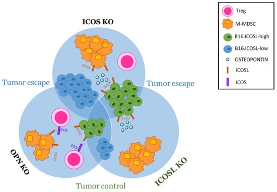 This study investigates the role in tumor cell metastasis of the ICOS/ICOSL/OPN network, comparing the metastasizing capability of two variants of melanoma B16-F10 cells, respectively expressing high and low levels of ICOSL. The study used wild-type mice and three strains of KO mice, lacking either ICOS, or OPN, or ICOSL. It emerged that the three members of the ICOS/ICOSL/OPN network play distinct and differing roles, possibly acting both at the tumor cell level and at that of the TME. These differing effects may be ascribed to the complexity of the ICOS/ICOSL/OPN network, in which (1) both ICOS and OPN bind to ICOSL, but exert different, often opposing, effects on the cell that expresses ICOSL; (2) OPN also binds other surface receptors, such as integrins and CD44; (3) OPN and its ligands (ICOSL, integrins, and CD44) can be expressed by tumor cells and by several cell types of the TME, influencing tumor cell survival, proliferation, and metastasis; (4) ICOS can be expressed by different types of T cells, including effector and Treg cells, and also by some other cell types in the TME, such as DCs and macrophages. Moreover, OPN produced by tumor cells may lack important domains and may carry different post-translational modifications, making it structurally and functionally different from that produced by other cell types [30].