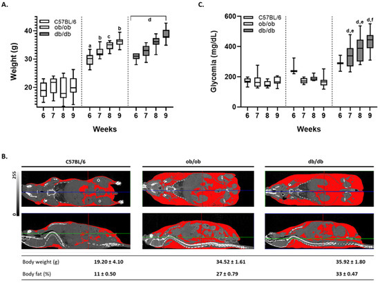 Only db/db animals presented sustained hyperglycemia despite both transgenic models developed the same levels of obesity. Follow up of the animal phenotype from 6 to 9 weeks of age. (A) Body weight comparison between C57BL/6J, ob/ob, and db/db animals, along time, maintained on a standard ad libitum diet. (B) Micron-scale computed tomography of 8-week-old C57BL/6J, ob/ob, and db/db animals. Representative images of coronal (upper panels) and sagittal (lower panels) orientations. Adipose tissue is highlighted in red, and the table depicts the percentage of body fat for the three animal strains. The grayscale indicates areas of density between 0 and 255 HU on the micro-CT slices shown. Coloring grids displayed are guides for anatomical comparison. (C) Time-dependent non-fasting blood glucose levels of C57BL/6J, ob/ob, and db/db models. Shown are the values of 18 age-matched control (white), ob/ob (light gray), and db/db (dark gray) animals, per time-point. Box-and-whisker plot represented by 25th and 75th quartiles, line within the box denotes the median, and the whiskers extend from minimum to maximum values. Statistical analyses of the weight and glycemia, across categories, were conducted using the median in the nonparametric Kruskal–Wallis test (a: C57BL/6J vs. ob/ob, p ≤ 0.0001; b: C57BL/6J vs. ob/ob, p ≤ 0.001; c: C57BL/6J vs. ob/ob, p < 0.05; d: C57BL/6J vs. db/db, p ≤ 0.0001; e: ob/ob vs. db/db, p ≤ 0.01; f: ob/ob vs. db/db, p ≤ 0.0001).