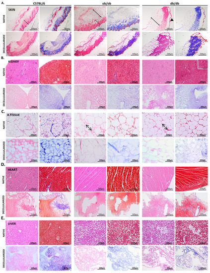 Native tissues of transgenic mice strains present evident histological alterations; however, ECM scaffolds are equally maintained after decellularization. Optical microscopy micrographs of native (upper panels) and decellularized (lower panels) tissue sections. Representative images of skin (A); kidney (B); adipose tissue (C); heart (D) and liver (E) samples obtained from C57BL/6J, ob/ob, and db/db animals. Depicted are histology H&E (left panels) and Masson’s Trichrome (right panels) stainings, with scale bars included in each image (200 or 500 µm as indicated, and 100 µm in the inset). Asterisk, skin muscle layer; thin arrow, skin adipose layer; dashed line, skin dermis; arrowhead, epidermis; bold arrow, adipocyte hypertrophy.