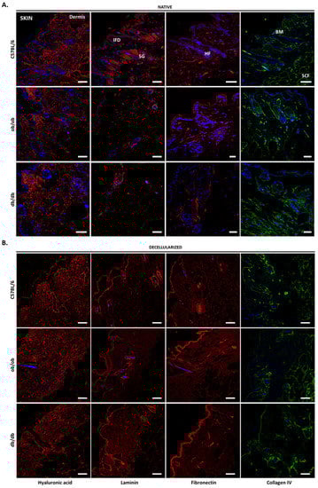 To further characterize the native and decellularized tissues, we examined, by immunofluorescence, the composition, and distribution of four major ECM components: hyaluronic acid, laminin, fibronectin, and collagen type IV. In the skin of C57BL/6J, ob/ob, and db/db animals, hyaluronic acid was present at the basement membrane, though mainly in the papillary and reticular dermis, as well as the subcutaneous fat layer, where it surrounds adipocytes. This distribution was maintained in the decellularized matrices (Figure 4). Laminin, which presented decreased expression in obese non-diabetic and diabetic mice (Figure 4A), located at the hair follicles, where it is known to regulate the dermal papilla function. The hair follicle localization of laminin is especially noticeable in the decellularized skin (Figure 4B). This ECM protein was also found in sebaceous glands and, to a less extent, in the interfollicular epidermis. Fibronectin presented a scattered pattern throughout all skin layers, with no noticeable differences among strains, either in native or decellularized tissues. As for collagen IV, it was observed to be the major constituent of the basement membrane, hair follicles, and subcutaneous fat layer (Figure 4A) [16].