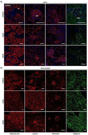 Kidney ECM components prior to and after decellularization. Representative confocal microscopy images of native (A) and decellularized (B) kidney sections from C57BL/6J, ob/ob, and db/db mice. Confocal microscopy images of immunostaining for hyaluronic acid (first column), laminin (second column), fibronectin (third column), and collagen IV (forth column). Nuclei are stained in blue (with DAPI). RT, renal tubules; MM, mesangial matrix; GBM, glomerular basement membrane. Scale bar: 100 μm.