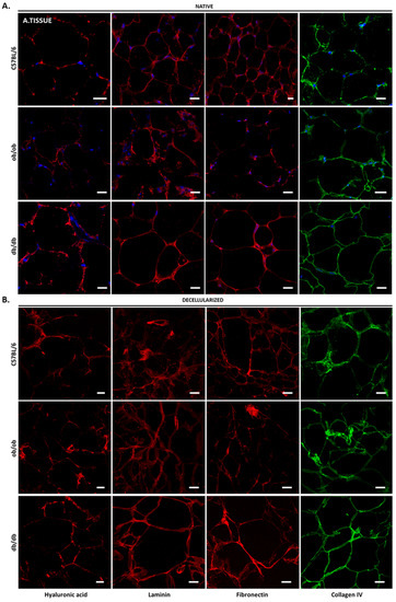 Concerning the adipose tissue, the ECM surrounding each adipocyte, designated as basal lamina, contained hyaluronic acid, laminin, fibronectin, and collagen type IV (Figure 6), although differently distributed in C57BL/6J, ob/ob, and db/db animals. While in native samples wild type mice presented less collagen IV than transgenic animals, in obese non-diabetic individuals, a reduction of hyaluronic acid and fibronectin was observed in comparison with C57BL/6J controls and db/db mice. This suggests the existence of clear differences among the intraperitoneal fat depots of each animal strain. In acellular adipose tissue, the presence of the four matrices components analyzed was maintained, with the native cues being kept in each scaffold (Figure 6B).