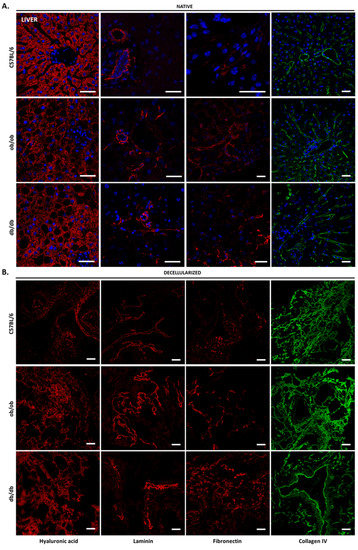 ECM components of native and decellularized liver. Immunohistochemical staining of ECM components from native (A) and decellularized (B) liver sections of C57BL/6J, ob/ob, and db/db mice. Confocal microscopy images of hyaluronic acid (first column), laminin (second column), fibronectin (third column), and collagen IV (forth column) immunostained liver samples. Nuclei are stained in blue (with DAPI). Scale bar: 100 μm.
