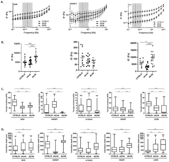 To evaluate the effect of diabetes on the ECM viscoelastic properties, skin, kidney, and adipose tissue matrices from C57BL/6J, ob/ob, and db/db animals were analyzed by rheology. First, we determined the linear viscoelastic region (LVR) by performing both frequency and amplitude sweeps on three independent samples from skin, kidney, and adipose tissue matrices. Such evaluation revealed that frequency sweeps ranged from 0.01 Hz to 3 Hz, and the shear strain was 0.03%, 0.39%, and 0.04% for skin, kidney, and adipose tissue, respectively (Figure 8). In addition, we observed that the viscous component (G″, imaginary part) is smaller than the elastic component (G′, real part) of the complex shear modulus in approximately one order of magnitude in the three tissues analyzed (Figure S4). Secondly, the amplitude of the complex shear modulus (G*) was determined along each frequency range and, from the LVR, the value of each matrix G* was retrieved and compared among mice strains (Figure 8A,B). Interestingly, the skin ECM G* amplitude was significantly higher in diabetic animals than in obese or wild type mice. This may relate with the alterations found through histology, i.e., we expect that the muscle layer loss together with the compact dermis, observed in the skin of db/db murine model, results in the increase of ECM rigidity (Figure 8B). The comparison between kidney matrices revealed no statistically significant differences. Yet, there was a tendency for lower G* on the db/db ECM, opposed to a higher complex shear modulus amplitude on the C57BL/6J matrices (Figure 8B). Importantly, when analyzing the intraperitoneal adipose tissue of each animal strain, striking differences were found between obese and diabetic mice. The adipose depots in db/db animals presented higher G* amplitude than those in ob/ob, although both strains present the same weight levels and fat accumulation (Figure 1). To our best knowledge, this data demonstrates for the first time that obese and diabetic intraperitoneal adipose tissue display important biomechanical differences regarding their ECM. Thus, the morphological alterations observed in ob/ob and db/db matrices are sufficiently dramatic to produce biomechanical alterations, as observed above [17,18,19]. However, to further explore the differences on the mechanical properties of scaffolds at a smaller scale, decellularized matrices from each organ and tissue were evaluated by atomic force microscopy (AFM). For that, formaldehyde-fixed samples were embedded in OCT and transversal slices with 30 µm were analyzed for their Young’s Modulus values (stiffness parameter), as well as indentation depth (Figure 8C,D, respectively). Interestingly, when comparing the Young’s Modulus values of C57BL/6J, obese, and diabetic mice samples, statistically significant differences were identified in all matrices. The db/db acellular tissues, with the exception of the skin, presented the lowest value of Young’s Modulus, indicating that diabetic ECM presents the lowest stiffness (highest tissue elasticity) when compared with obese or wild type controls (Figure 8C). Obese kidney and adipose tissue ECM displayed higher stiffness than the same tissues of diabetic and C57BL/6J mice. These results point out, once again, relevant differences between the ob/ob and db/db animal models. As for the skin, AFM measurements were restricted to the epidermis as this was the region with the most profound histological alterations. Collected data indicated that C57BL/6J matrices were those with the highest Young’s Modulus, contrary to rheometry measurements. However, the stiffness of the skin determined by AFM was significantly higher in diabetic mice than in obese mice, as shown before in rheology studies by the G* amplitude values. As for the indentation depth (Figure 8D), the values obtained are in line with those of the Young’s Modulus: higher indentation depth associates with lower Young’s Modulus values (i.e., higher elasticity of the sample). In summary, the data obtained herein on the mechanical properties of the evaluated matrices strongly highlight substantial differences between C57BL/6J, obese, and diabetic ECMs. Knowing that biomechanical features have an important role in cell organization, profile, and function, it is thus essential to further investigate the biological impact of these biomechanical contrasts.