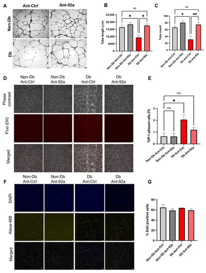 Inhibition of miR-92a rescues diabetic phenotype in HCMEC. (A–C) Bright field images and analysis of tube formation parameteres in Db or Non-Db HCMEC upon downregulation of miR-92a (Ant-92a) or control (Ant-Ctrl). (D,E) Phase contrast images, fluorescence images and analysis (fold change) of adherent THP-1 (DiI-labeled) count on Db or Non-Db HCMEC monolayer upon downregulation of miR-92a (Ant-92a) or control (Ant-Ctrl). (F,G) Fluorescence images and analysis of cell proliferation by EdU incorporation in primary Db or Non-Db HCMEC upon downregulation of miR-92a (Ant-92a) or control (Ant-Ctrl). Statistical analyses by one-way ANOVA (n ≥ 3). Scale bars = 100 μM. ns = not significant; * p < 0.05; ** p < 0.01.