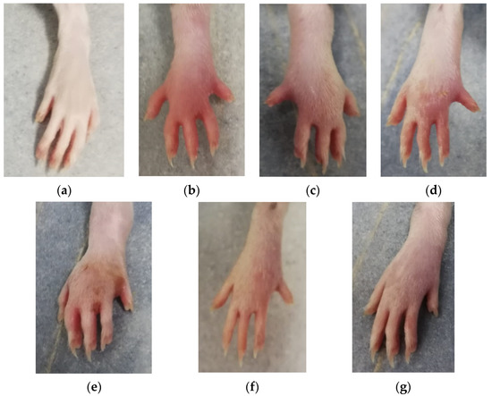 Paw edema at 5 h after carrageenan administration: (a) C group; (b) AI group; (c) AID group; (d) AIcC200 group; (e) AIcC200D group; (f) AInC200; (g) AInC200D group. Abbreviations: C—control; AI—Acute inflammation; D—Diclofenac; cC—conventional curcumin solution (200 mg/kg b.w.); nC—solution of curcumin nanoparticles (200 mg/kg b.w.).