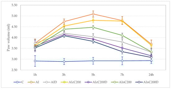 Effects of Diclofenac, cC an nC on carrageenan-induced paw edema. Circles represent the mean value of each group, and the values of one standard deviation give the wishers. Abbreviations: C—control; AI—Acute inflammation; D—Diclofenac; cC—conventional curcumin solution (200 mg/kg b.w.); nC—solution of curcumin nanoparticles (200 mg/kg b.w.).