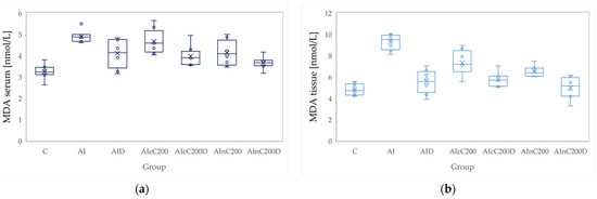 Variation by groups of MDA (malondialdehyde): (a) in the serum—dark blue (b) in the tissue—light blue. Abbreviations: C—control; AI—Acute inflammation; D—Diclofenac; cC—conventional curcumin solution (200 mg/kg b.w.); nC—solution of curcumin nanoparticles (200 mg/kg b.w.).
