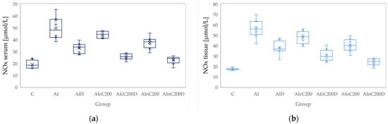 Variation by groups of NOx (nitric oxide): (a) in the serum—dark blue (b) in the tissue—light blue. Abbreviations: C—control; AI—Acute inflammation; D—Diclofenac; cC—conventional curcumin solution (200 mg/kg b.w.); nC—solution of curcumin nanoparticles (200 mg/kg b.w.).