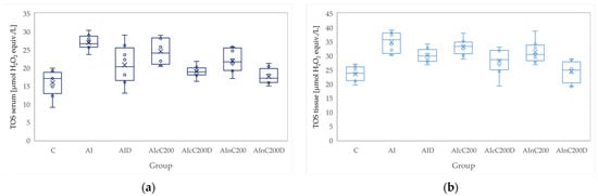 Variation by groups of TOS (total oxidative status): (a) in the serum—dark blue (b) in the tissue—light blue. Abbreviations: C—control; AI—Acute inflammation; D—Diclofenac; cC—conventional curcumin solution (200 mg/kg b.w.); nC—solution of curcumin nanoparticles (200 mg/kg b.w.).