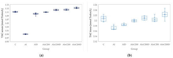 Variation by groups of TAC (total antioxidant capacity): (a) in the serum—dark blue (b) in the tissue—light blue. Abbreviations: C—control; AI—Acute inflammation; D—Diclofenac; cC—conventional curcumin solution (200 mg/kg bw); nC—solution of curcumin nanoparticles (200 mg/kg b.w.).