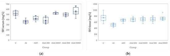 Variation by groups of SH (total thiols): (a) in the serum—dark blue (b) in the tissue—light blue. Abbreviations: C—control; AI—Acute inflammation; D—Diclofenac; cC—conventional curcumin solution (200 mg/kg b.w.); nC—solution of curcumin nanoparticles (200 mg/kg b.w.).