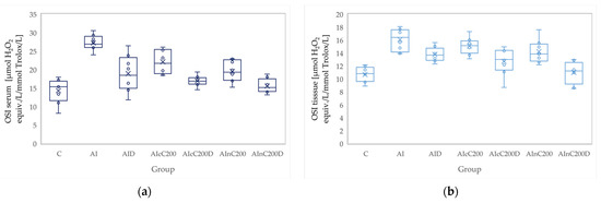 Variation by groups of OSI (oxidative stability index): (a) in the serum—dark blue (b) in the tissue—light blue. Abbreviations: C—control; AI—Acute inflammation; D—Diclofenac; cC—conventional curcumin solution (200 mg/kg b.w.); nC—solution of curcumin nanoparticles (200 mg/kg b.w.).