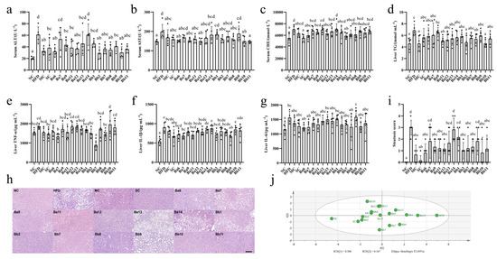 The effect of Bifidobacterium on liver injury in NAFLD mice. (a) ALT in serum; (b) AST in serum; (c) CHE in serum; (d) TG in liver; (e) TNF-α in liver; (f) IL-1β in liver; (g) IL-6 in liver; (h) Liver histopathology score, (i) Principal Component Analysis of each index of liver injury. (j) Principal component analysis of each index. Mean values with different letters (a–e) over the bars are significantly different (p < 0.05) according to Duncan’s multiple range test.