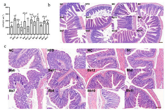 The concentration of LPS in the HFD group was 208.19 ± 36.74 Eu/mL, which was significantly higher than that in the NC group (120.87 ± 21.27 Eu/mL), indicating that the long-term continuous intake of HFD promoted the increase of intestinal permeability (Figure 4a, p < 0.05). Compared with the HFD group, the serum LPS concentration in MC, SC, Ba11, Bb8 and Bb11 groups was significantly decreased (Figure 4a, p < 0.05), indicating that intervention with Ba11, Bb8 and Bb11 could improve intestinal permeability.