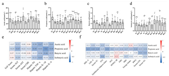Effects of Bifidobacterium on SCFAs in NAFLD mice. (a) acetic acid; (b) propionic acid; (c) isobutyric acid; (d) butyric acid; (e) the correlation analysis of SCFAs and hepatic damage; (f) the correlation analysis of SCFAs and alleviation pathways. Mean values with different letters (a–d) over the bars are significantly different (p < 0.05) according to Duncan’s multiple range test. Cell injury indexes: serum ALT, serum AST and serum CHE; hepatic lipid accumulation index: hepatic TG. Liver inflammation indexes: hepatic TNF-α, IL-1β and IL-6. Liver lipid metabolism indexes: HDL-C, LDL-C, serum TC, serum TG, FFA. Epididymal fat index and body weight gain. Sugar metabolism indexes: AUC, HOMA-IR, FBG, PB.; Intestinal permeability index: serum LPS.