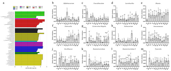 Effect of Bifidobacterium on intestinal microbiota of NAFLD mice. (a) the LEfSe analysis of gut microbiota after intervention with bifidobacteria in NAFLD mice; (b) Bifidobacterium; (c) Faecalibaculum; (d) Lactobacillus; (e) Blautia; (f) Dubosiella; (g) Escherichia-Shigella; (h) Ileibacterium; (i) Intestinimonas; (j) Oscillibacter; (k) Ruminiclostridium; (l) Ruminiclostridium 9; (m) Tyzzerella. Mean values with different letters (a–e) over the bars are significantly different (p < 0.05) according to Duncan’s multiple range test.