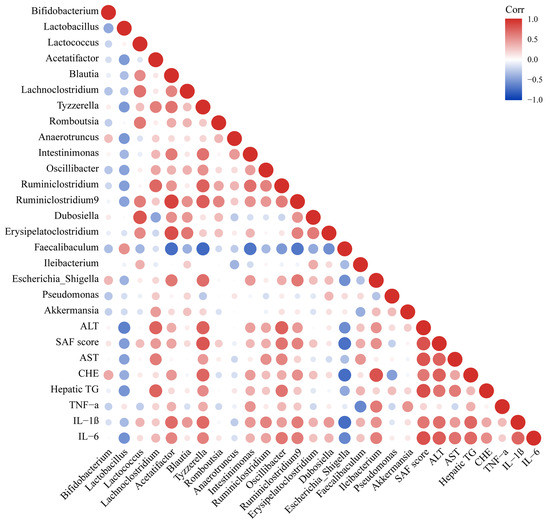 In order to explore the role of differential genera in the formation of NAFLD, a correlation analysis was conducted between the relevant indicators of NAFLD (liver cell injury, hepatic lipid accumulation, liver inflammation and liver pathology) and the intestinal microbiota (Figure 7). According to the results, the liver cell injury indices the liver pathology score displayed a strong positive correlation with Acetatifactor, Escherichia_Shigella, Intestinimonas, Oscillibacter, Ruminiclostridium, Ruminiclostridium 9 and Tyzzerella and negatively correlated with Faecalibaculum and Lactobacillus (|r| > 0.4). Hepatic lipid accumulation presented a strong positive correlation with the abundance of Ruminiclostridium and Tyzzerella (r > 0.4), and a strong negative correlation with the abundance of Faecalibaculum and Lactobacillus (r < −0.4). There was a strong positive correlation between the indexes of liver inflammation and the abundances of Blautia, Erysipelatoclostridium, Escherichia-Shigella, Intestinimonas, Oscillibacter, Ruminiclostridium, Ruminiclostridium 9 and Tyzzerella (r > 0.4) and a strong negative correlation with Faecalibaculum and Lactobacillus (r < −0.4). These results indicated that the formation of NAFLD was related to intestinal microbiota.