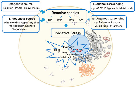The imbalance between the generation of reactive species and the antioxidant defense system results in oxidative stress and further damage to cellular macromolecules. ROS—reactive oxygen species; RNS—reactive nitrogen species; RSS—reactive sulfur species; RCS—reactive carbonyl species; VC—ascorbic acid; VE—tocopherol. Created by BioRender.com.