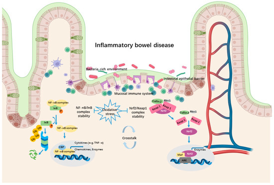 Schematic representation of the inflammatory response of antioxidant pathways in the intestinal environment. In the immune cells, oxidation stress can enhance the dissociation of the NF-κB/IκB complex and the Nrf2/Keap1 complex, which cause the induction of pro-inflammation genes (e.g., cytokines, chemokines) and antioxidant genes (e.g., enzymes). The crosstalk between these two pathways through a complex molecular interaction plays an important role in IBD. NF-κB—nuclear factor-kappaB; Ub—ubiquitination; CBP—CREB-binding protein; Nrf2—NF-E2p45-related factor 2; Keap1—Kelch-like ECH-associated protein 1; ARE—antioxidant responsive element. Created by BioRender.com.