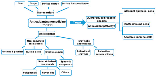 Multiple antioxidant nanomedicines are designed to scavenge the overproduced reactive species (non-enzymatic antioxidants) or enhance the catalyzation of antioxidant processes (enzymatic antioxidants), leading to attenuate the inflammation within the gut. In order to specifically target the inflammatory site (intestinal epithelial cells or the intestinal immune system), the size, shape, surface charge, and surface functionalization should be taken into consideration. The classification of the generally-used antioxidants to treat IBD has been summarized. IBD—inflammatory bowel disease.