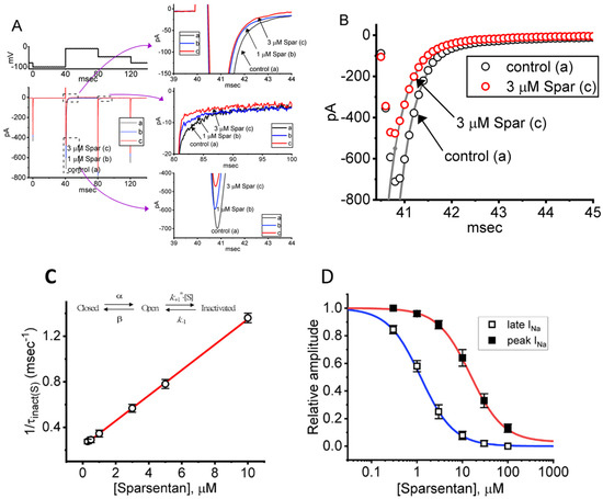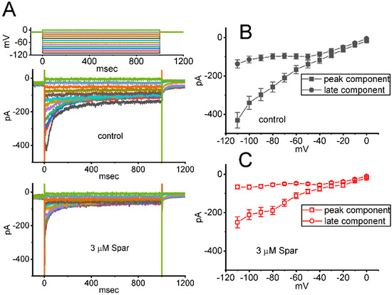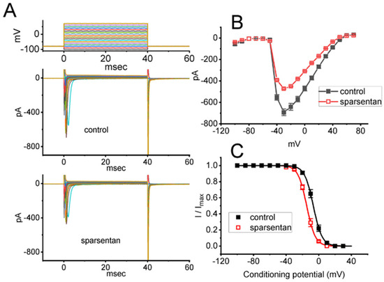 It has been established that the voltage-gated Na+ (NaV) channels contain the larger protein superfamily of voltage-gated ion channels and that their channel activity is key to the initiation, generation and propagation of action potentials in electrically excitable cells [21,22,23]. The NaV-channel family contains nine members which are denoted NaV1.1 through NaV1.9 [24]. These channels contain four internally homologous domains, referred to as DI to DIV, each of which consists of a six-helical transmembrane domain (S1–S6) and a reentry P loop residing between S5 and S6 [23,24,25]. Upon brief depolarization, NaV channels readily go through a rapid transition from their resting (closed) state to the open state, and then to the inactivated state [22,23,24]. Several inhibitors or activators have been previously demonstrated to preferentially perturb the late component of voltage-gated Na+ current (INa) [21,22]. However, the issue of how sparsentan could perturb the amplitude of kinetic gating of membrane ionic currents (e.g., voltage-gated Na+ current [INa]) remains unmet. Alternatively, different types of K+ currents (e.g., delayed-rectifier K+ current [IK(DR)] and erg-mediated K+ current [IK(erg)]) might be regulated by binding to AngII or ETA receptors [15,16,17,18,22]. Whether sparsentan, per se, might modify these ionic currents is also unclear.