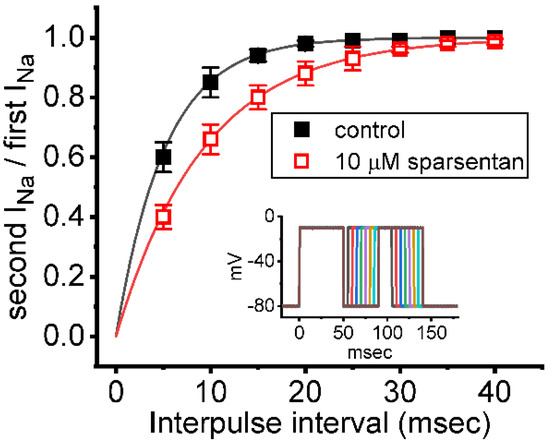 Effect of sparsentan on the recovery of INa block. In these experiments, as whole-cell configuration was firmly established, two-step voltage protocol was imposed on the examined cells. Inset indicates the voltage-clamp protocol applied. The relationship of interpulse pulse versus the relative amplitude achieved in the absence (solid squares) and presence (open squares) of 10 μM sparsentan (mean ± SEM; n = 8 for each point). The relative amplitude in the ordinate achieved obtained as the second amplitude activated by 50 ms depolarizing pulse from −80 to −10 mV was divided by the first one. The smooth curve in the absence and presence of 10 μM sparsentan was fit to single exponential function with time constant of 5.2 and 9.3 ms, respectively. Of note, the existence of sparsentan can result in a prolongation of recovery in INa block.