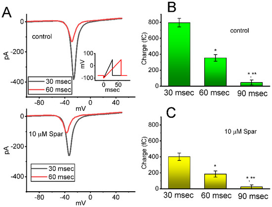 Next, whether the instantaneous window INa (INa(W)) evoked by the ascending ramp pulse was able to be modified by the presence of sparsentan was further investigated in GH3 cells. In an effort to perform these experiments, the tested cell was maintained at −80 mV and the descending voltage pulse from −100 to +50 mV with a duration of 30 or 60 ms was thereafter imposed on it. As shown in Figure 4A, as cells were exposed to sparsentan (10 μM), the amplitude of INa(W) achieved by the downsloping ramp with a duration of 30 or 60 ms was substantially reduced. For example, the presence of 10 μM sparsentan decreased the peak amplitude of INa(W) activated by 30 ms ascending pulse from 389 ± 28 to 258 ± 22 pA (n = 8, p < 0.05). After washout of sparsentan, current amplitude was returned to 385 ± 25 pA (n = 7). The summary bar graph shown in Figure 4B,C depicts the total charges collected in response to the upsloping ramp pulse (from −100 to +50 mV) with a duration of 30 or 60 ms in the absence and presence of 10 μM sparsentan, respectively. Therefore, the results demonstrate that the amplitude or total charge of INa(W) evoked by abrupt ascending ramp voltage can evidently be reduced in the presence of sparsentan.