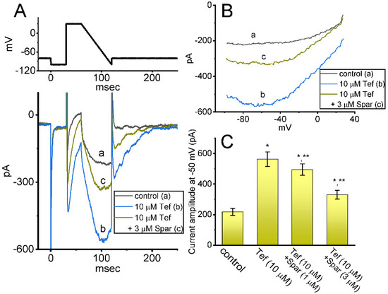 Effect of sparsentan (Spar) on resurgent INa (INa(R)) identified in GH3 cells. These experiments were conducted in cells bathed in Ca2+-free Tyrode’s solution, and we filled up the electrode with Cs+-enriched solution. The examined cell was held at −80 mV, and to ensure complete recovery of INa, the voltage preceding depolarizing pulse to +30 mV was set at −100 mV for 30 ms; thereafter, a descending ramp pulse from +30 to −100 ms with a duration of 60 ms was applied to evoke INa(R). (A) Representative current traces obtained in the control period (a) and during cell exposure to 10 μM tefluthrin (b, Tef) or to 10 μM Tef plus 3 μM sparsentan. The top panel shows the voltage-clamp protocol imposed, and downward deflections signify occurrence of inward current. (B) Relationship of instantaneous INa(R) versus membrane potential. a: control; b: 10 μM tefluthrin; c: 10 μM tefluthrin plus 3 μM sparsentan. (C) Summary bar graph showing effect of tefluthrin and tefluthrin plus sparsentan (1 or 3 μM) on the amplitude of INa(R) in GH3 cells (mean ± SEM; n = 7 for each bar). INa(R) amplitude activated by the 60 ms downsloping ramp pulse from +30 to −100 mV was measured at the level of −50 mV. Statistical analysis was made by one-way ANOVA (p < 0.05). * Significantly different from control (p < 0.05) and ** significantly different from Tef (10 μM) alone group (p < 0.05). Of note, as cells were exposed to Tef, subsequent presence of sparsentan was able to Tef-stimulate INa(R) in these cells.
