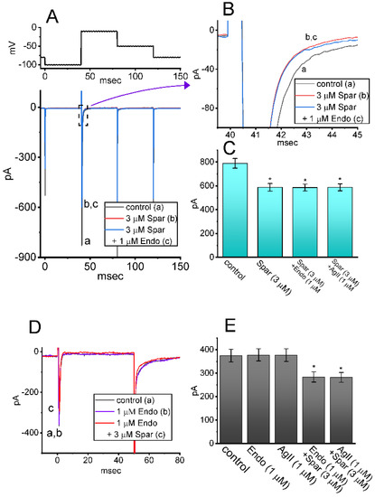 Sparsentan has been previously demonstrated to be a dual antagonist of endothelin type A (ETA) and angiotensin II (AngII) receptors [2,3,4,34]. The activity of ETA or AngII receptors has been reported to be abundantly distributed in pituitary cells [15,18,35,36]. For these reasons, we explored whether sparsentan-mediated inhibition of INa found in GH3 cells could be altered by subsequent addition of endothelin 1 or angiotensin II. As shown in Figure 7A–C, the existence of 3 μM sparsentan resulted in a significant reduction in peak INa activated by short depolarizing voltage; however, further application of either endothelin 1 (1 μM) or angiotensin II (1 μM), still in the presence of sparsentan, failed to modify sparsentan-mediated reduction of peak INa in these cells. Furthermore, in the presence of endothelin 1 (1 μM) or angiotensin II (1 μM), subsequent addition of 3 μM sparsentan was effective at decreasing peak amplitude of INa (Figure 7D,E). It may be excluded, therefore, that sparsentan-mediated changes in the amplitude and gating of INa in response to short depolarizing pulse are largely associated with its antagonistic effect on either ETA or AngII receptors, despite the existence of these receptors in pituitary cells [35,36].