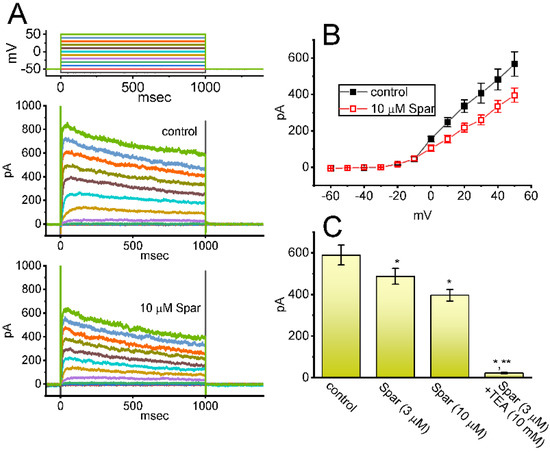 Effect of sparsentan (Spar) on delayed-rectifier K+ current (IK(DR)) recorded from GH3 cells. These experiments were performed in cells bathed in Ca2+-free Tyrode’s solution containing 1 μM TTX and 0.5 mM CdCl2, and the electrode was filled with K+-containing solution. (A) Representative current traces obtained in the control period (top panel) and during cell exposure to 10 μM sparsentan (bottom panel). The uppermost part shows the voltage-clamp protocol applied. (B) Averaged I-V relationships of IK(DR) achieved in the absence (filled squares) and presence (open squares) of 10 μM sparsentan (mean ± SEM; n = 8 for each point). Current amplitude with or without sparsentan was achieved at the end of each voltage step. Statistical analyses were made by two way-ANOVA for repeated measures, P (factor 1, groups among data taken at different level of membrane potentials) < 0.05, P (factor 2, groups between the absence and presence of sparsentan) < 0.05, P (interaction) < 0.05, followed post hoc Duncan’s multiple-range comparisons (p < 0.05). (C) Summary bar graph showing effect of sparsentan (Spar, 3 and 10 μM) and sparsentan (10 μM) plus tetraethylammonium chloride (TEA, 10 mM) on the IK(DR) amplitude at +50 mV. Each bar represents the mean ± SEM (n = 8). Statistical analysis was made by one-way ANOVA. * Significantly different from control (p < 0.05), and ** significantly different from sparsentan (3 μM) alone group (p < 0.05).