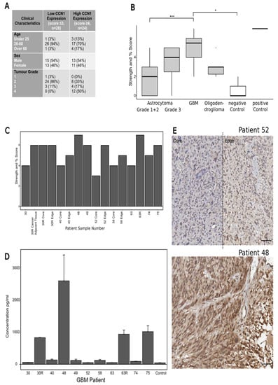 CCN1 expression in patient samples. (A) Combined scoring of CCN1 staining strength and percentage of the core covered on a TMA containing astrocytomas grade 1–2, GBM, oligodendroglioma, cancer adjacent brain tissue as a control and an adrenal core as a positive control. (B) The clinical characteristics of the TMA astrocytoma samples. The results reveal associations of CCN1 expression levels with tumour grade. 86 % of the samples with low CCN1 expression are grade 2 astrocytomas, whilst 50% of the samples with high CCN1 expression are grade 4 astrocytomas (GBM). There were no associations of CCN1 levels with age or sex. (C) Combined scores of CCN1 staining intensity and percentage of staining covering the samples collected from 9 GBM patients during surgery. Recurrent tumour samples were also collected for patients 30 and 63 (30R and 63R). Samples of the core and edge of the tumour were collected for patients 30, 40, 52 and 58. Patient 30 also had a sample of cancer adjacent tissue collected. (D) CCN1 concentration in 9 patient blood serum samples. Blood samples from patient no. 30 and 63 were also collected at their recurrent GBM tumour surgery (30R and 63R). The percentage increase of each patient compared to the control was also calculated. (E) CCN1 IHC staining correlates with the CCN1 concentration determined for the matched blood samples. The GBM tissue sample from patient no. 52 presented with the lowest concentration of CCN1 in the blood (51.51 pg/mL) which correlates with the low intensity CCN1 staining in the tissue samples. The GBM tissue sample from patient no. 48 presented with the highest concentration of CCN1 in the blood (2588.041 pg/mL), which correlates with the high intensity CCN1 staining in the tissue sample. Scale bar = 50µm, Magnification 20×. Asterisks show statistical significance. * p ≤ 0.05, *** p ≤ 0.001, Kruskal–Wallis: p = 0.0000344. Significant differences were marked in the graphs when available.