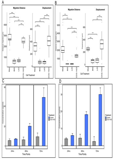 To better understand the relevance of our findings on the correlation between CCN1 expression and tumour aggressiveness/grade and concentration in matched patient serum, we next investigated the effects of blocking CCN1 in the established glioma cell lines U251 and U87. CCG-1423 is known to inhibit CCN1 production [] and was therefore used to observe effects on cell migratory behaviour by live-cell imaging. The commercially available inhibitors BIO and Lithium chloride (LiCl) are well known for their inhibitory effects on migration in glioma cells [,] and were used as positive controls for comparison with CCG-1423 effects. Migratory distance (i.e., accumulated travelled distance over time), and cell displacement (i.e., vector length between cell positions at start and end of experiment) of treated cells are shown in Figure 2A,B and Supplementary Figure S2.