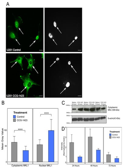 To investigate this further, we decided to investigate the regulation of CCN1 production. CCG-1423 binds to the transcriptional co-activator MKL1, preventing its nuclear import and therefore activation of MKL1/SRF-dependent transcription and CCN1 production []. Immunofluorescence labelling was used to visualise the accumulation of MKL1 in the cytoplasm of U251 cells treated with CCG-1423 in comparison to untreated control cells. As U87 and U251 cell lines had shown so far equal reactions to CCG-1423 treatment and U251 is the more representative cell line in terms of adopting mesenchymal migration with a pronounced lamellipodia front as observed by live-cell imaging, only results for U251 is shown here. There appeared to be a marked increase in cytoplasmic MKL1 in cells treated for 72 h with CCG-1423 with a concomitant loss of nuclear MKL1 in comparison to the control (Figure 3A,B).