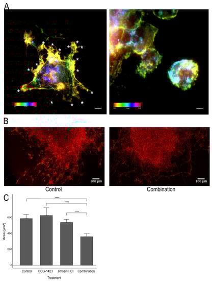 In our previous publication [], we reported on a mesenchymal–amoeboid switch in the U251 cell line characterised by loss of major protrusions/lamellipodia in cells treated with CCG-1423 and a striking increase in the number of filopodia, shown here at high resolution to highlight the phenotypic differences (Figure 4A). Following on these original findings, we reasoned that targeting Rac activation and RhoA-driven cell migration by a combination treatment with CCG-1423 and a RhoA inhibitor, such as Rhosin HCL, will reduce cell migration in the cells. We used a combination treatment and then analysed U87-generated spheroids to assess the effect of the combination treatment by confocal microscopy. We utilised U87 as a proof of principle here as U87 rapidly migrates in a 3D, collagen-based environment characterised by producing extensive protrusions emanating from the original spheroid. Our preliminary findings indicate that treatment of the cells with a combination of CCG-1423 and Rhosin HCl induced a third shift potentially towards a collective cell migration as indicated by our findings that gap areas within the protrusions were significantly reduced (Figure 4B,C).