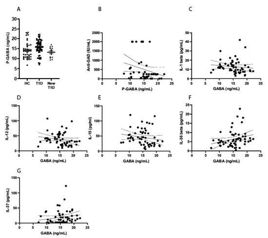 Interestingly, among GAD-positive T1D patients (n = 45), a negative correlation was observed between GAD-titers and endogenous GABA levels (Figure 1B). Although the reference limit for GAD-autoantibodies is >5 IU/mL, values between 5–50 are often clinically considered as low. There was n = 35 T1D patients who fulfilled a stricter criterion for GAD positivity (>50 IU/mL), and in this group, a stronger correlation to GABA levels was observed (r = −0.40, p = 0.018). In all T1D patients, GABA levels were positively correlated to IL-37 (r = 0.30, p = 0.026) and IL-36 beta (r = 0.34, p = 0.01). Additionally, in T1D patients, a negative correlation was observed between GABA levels and IL-12 (r = −0.29, p = 0.033), IL-15 (r = −0.29, p = 0.033) and IL-1 beta (r = −0.28, p = 0.034) (Figure 1C–G). The levels of circulating cytokines were similar in both HC and patients with T1D (Supplementary Table S1).