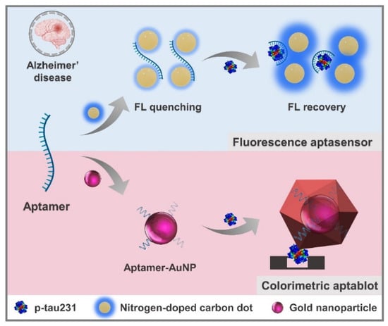 Among several p-tau biomarkers for AD, p-tau231 is a superior biomarker in distinguishing AD patients from healthy people. Therefore, the use of tau as a clinical biomarker of AD means that their determinations could improve the accuracy of diagnosis and the monitoring of therapeutic response []. Plasma p-tau231 not only displays the ability to identify AD patients, and to differentiate them from amyloid-β-negative cognitively unimpaired older adults, but also to distinguish AD patients with neurodegenerative disorders []. The diagnostic cutoff value of p-tau231 in cerebrospinal fluid is about 10.1 ng/mL, which was able to differentiate between AD patients and non-AD patients []. The as-prepared turn-on fluorescent NCD-based aptasensor and signal-amplified aptablotting are feasible to detect p-tau231 rapidly and sensitively in any samples for the early and accurate diagnosis of AD, depending on the laboratory facilities and equipment, supporting their potential application within the clinical setting. These highly sensitive colorimetric and fluorescent aptasensors, which do not require a time-consuming process, could be always available for medical staff to accurately diagnose AD, as well as to validate the possible prognostic pathology of AD, efficiently specifying targeting tau therapy [].