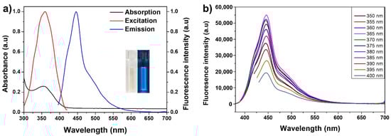 Due to the fluorescence-based sensing application of NCDs, it was crucial to investigate the optical properties of the NCDs for further application. UV–Vis and fluorescence spectra were performed to evaluate their detailed properties. The NCDs exhibit a pale yellow color in daylight, which observed the characteristic absorption peak at 357 nm that originated from the n–π transition of C=O bonds []. Further, NCDs displayed strong blue fluorescence under UV irradiation at 365 nm. The fluorescence emission peak was obtained at 445 nm when excited at 365 nm, indicating the strong dependence of the fluorescence excitation spectrum on the observation wavelength (Figure 2a). Different excitation wavelengths from 350 to 400 nm were analyzed to monitor the optimal fluorescence condition through the excitation-dependent behavior of NCDs. Figure 2b shows that the fluorescence emission intensity differs, but the emission peak does not shift under different excitation variation, exhibiting the maximum emission wavelength at 445 nm under excitation wavelength at 365 nm. Additionally, the long-term stability of the sensing platform is an important criterion for use in sensing applications. Hence, the fluorescence stability of NCDs was recorded after 3 months storage at 4 °C in a dark environment, which showed no significant change in fluorescence emission intensity (11.2% intensity reduction) (Figure S4 of the SI), suggesting that NCDs probes could be stored for a long time for further applications, without elimination of the fluorescence properties.